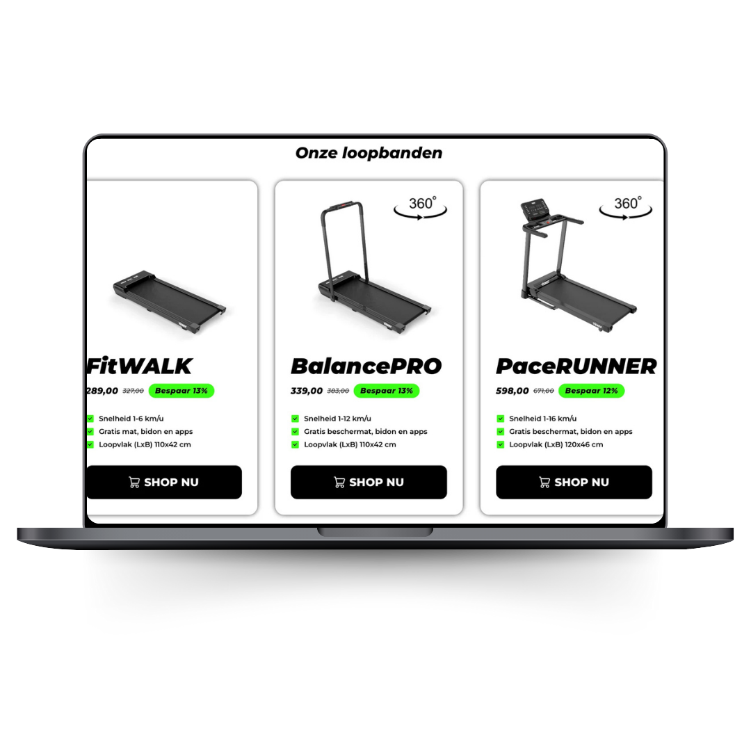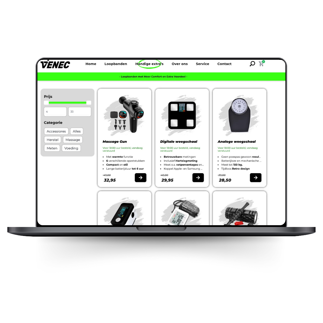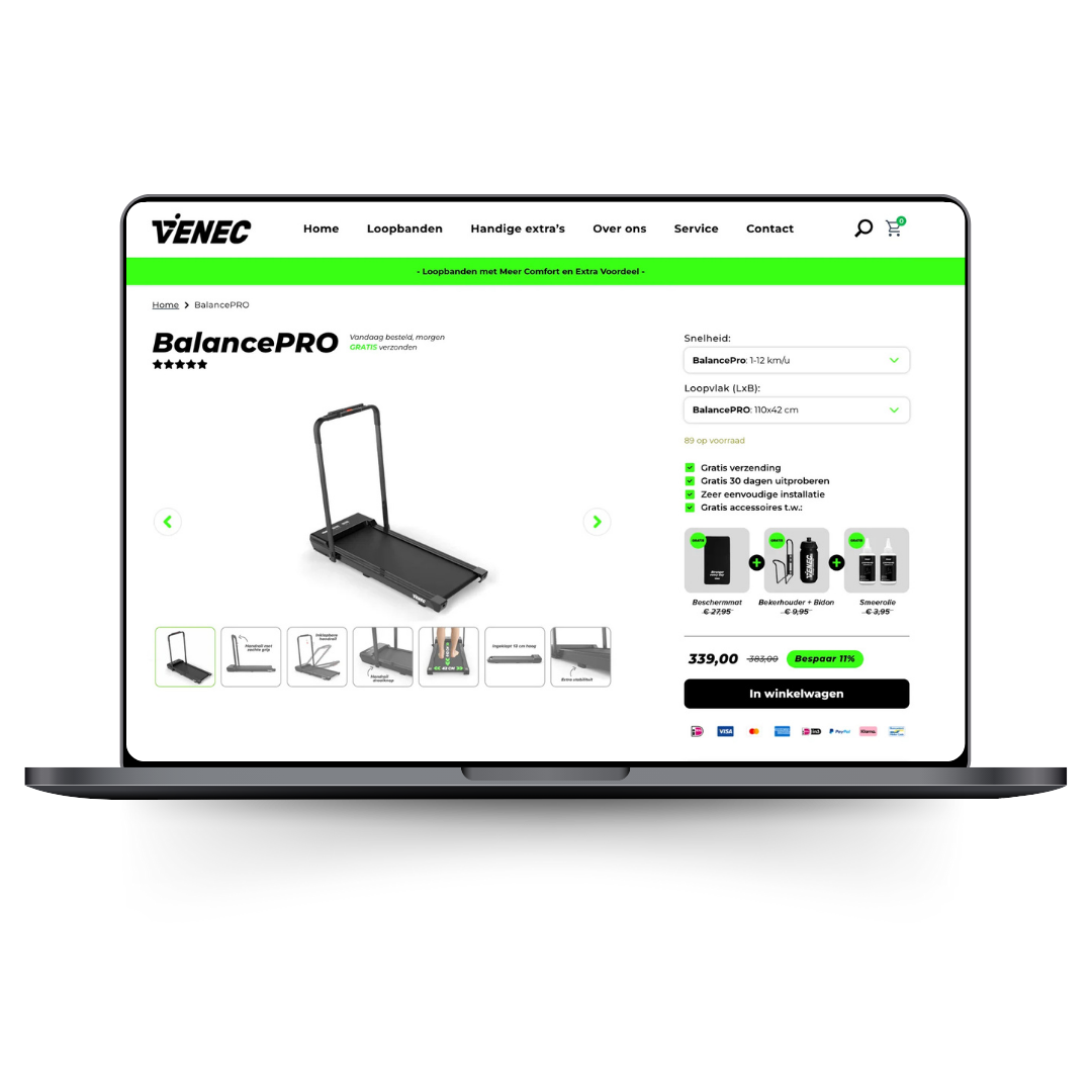 VENEC kwam bij mij met een duidelijke vraag: een compleet nieuwe webshop ontwikkelen voor hun fitness- en loopbandproducten. Er was nog geen bestaande website, geen structuur en geen visuele branding.